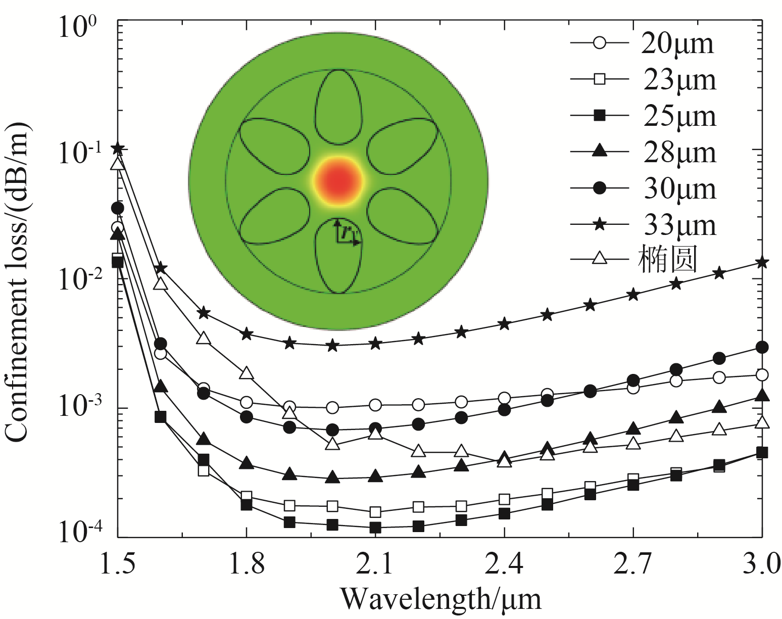 摘要:提出一种红外波段低损耗的空芯反谐振光纤,石英包层管为半圆半椭圆拼接结构,采用全矢量有限元法进行设计与研究。半椭圆管的半短长轴与半圆管的半径相等,将半圆管与半椭圆管进行拼接,改变半圆的半径以及半椭圆管的半长轴来改变靠近纤芯处的负曲率以及远离纤芯的正曲率,进而研究包层管的正负曲率对空芯反谐振光纤的损耗特性的影响,设计应用于1.5~3.0 μm波段的低损耗空芯反谐振光纤。结果显示负曲率较小正曲率较大时限制损耗效果更好。当靠近纤芯处为圆形半管远离纤芯处为椭圆半管,圆形半径ry=25 μm,椭圆的半长轴rx=65 μm,半短长轴ry=25 μm时,光纤最低限制损耗在波长2.1 μm处为8.22×10-2 dB/km。