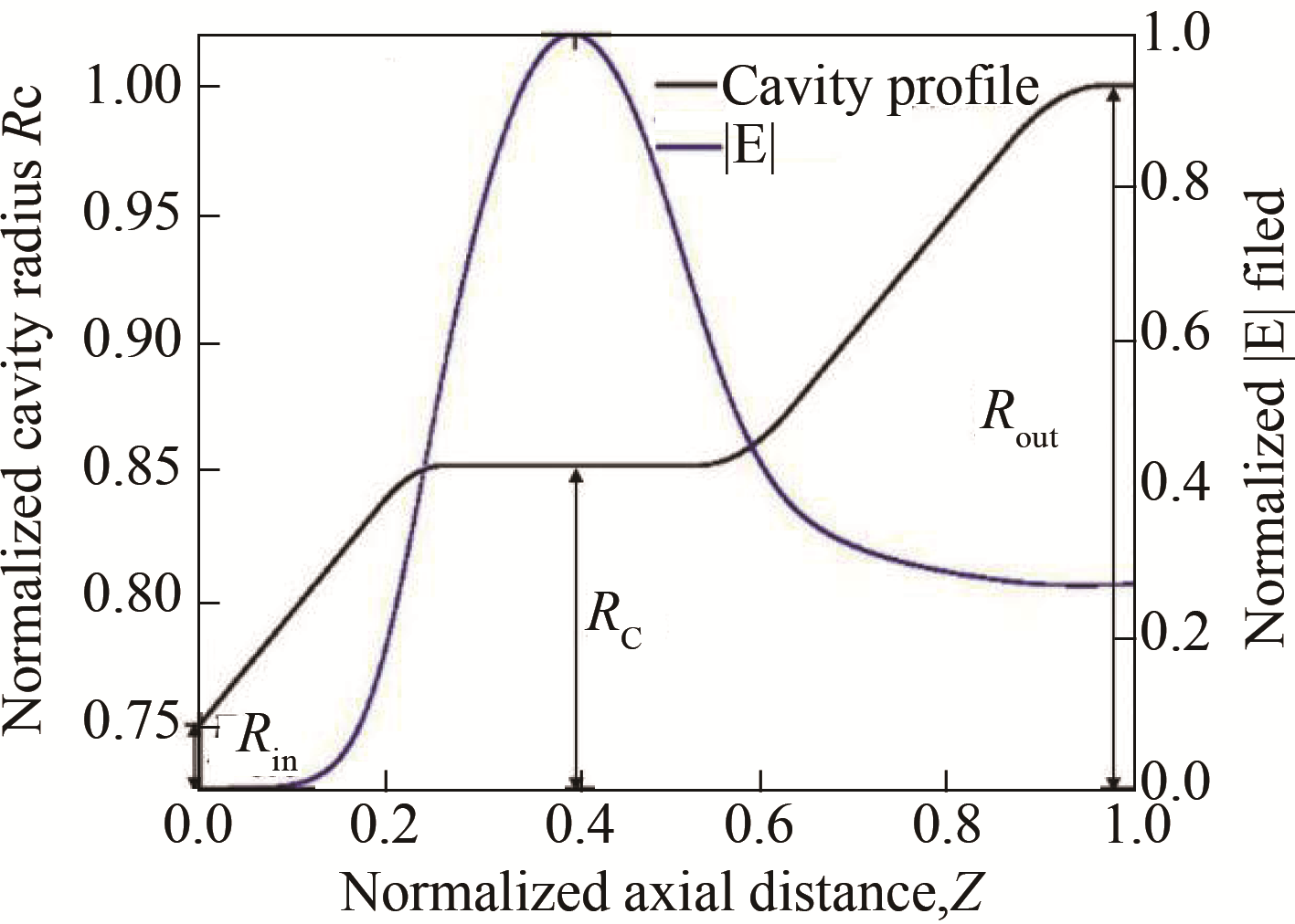 摘要:对基于12个周期的交错双排矩形波导慢波结构(staggered double rectangular waveguide slow wave structure,简记为SDRWSWS)的单谐振腔94.5GHz分布作用振荡器(extended interaction oscillator, EIO)进行了计算机模拟,给出了通过计算机模拟确定谐振腔结构参数及电子注参数的方法和步骤。提出了“相位再同步”的高效率方法,将谐振腔中从电子注输入端数起的第5~6个周期的慢波结构的周期降低到原来的90%左右,改变了谐振腔中轴向电场强度的分布,使轴向电场强度在远离输出口一端相对降低,而在靠近输出口一端相对升高,有助于电子注的调制随着电子注的行进而加强;同时,使在靠近输出口一端的轴向电场强度的相位增大了51.6o,从而与电子注的空间电荷波的相位保持同步并从电子注提取更多能量。计算机模拟结果证实,采用该技术的分布作用振荡器的功率和电子效率都得到显著提高,改善最大的数值是原来的2倍以上。