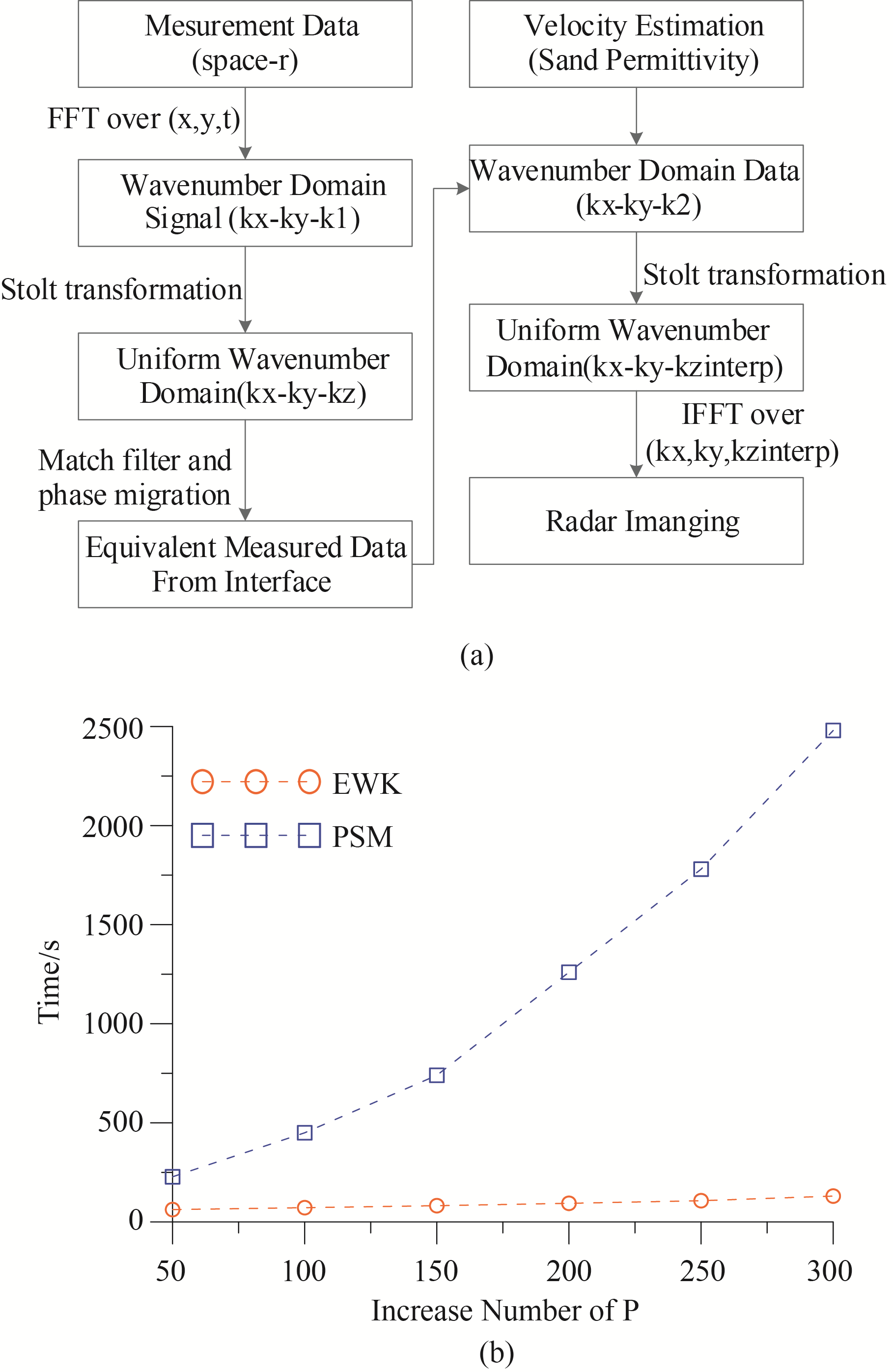 摘要:近年来,获取高分辨探地雷达图像以实现目标检测受到广泛关注。相位偏移补偿算法(PSM)可以针对不同介电常数的多层介质成像,在各领域应用广泛。受距离维像素循环计算过程影响,PSM成像速度慢。基于PSM相关理论基础,提出改进波数域的多层介质快速成像算法,在每个独立介质层中,通过快速傅里叶运算取代PSM算法中的像素迭代过程,可以有效降低成像时间。针对双层介质模型,提出基于目标顶点区域提取的波速估计方法,用于精确补偿相位成像。通过搭建双层介质实验平台,利用该算法获得了多种被埋目标高分辨图像,验证了算法的有效性。