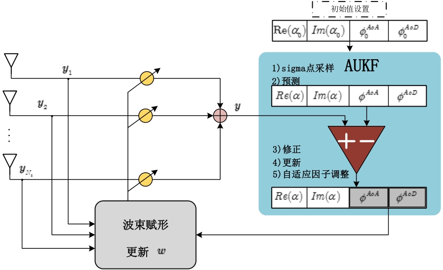 摘要:针对移动毫米波通信场景中收发波束存在角度偏差时接收信号质量急剧下降的问题,提出一种基于自适应无迹卡尔曼滤波(AUKF)原理的波束跟踪算法。针对低复杂度对于移动场景的适用性,该算法设计了一种有效的波束跟踪方案,在模拟波束形成架构中通过训练一个波束对以跟踪一条电磁波路径来保持有效的毫米波通信。通过引入自适应调节因子,在系统存在异常扰动时候,可以自适应调节预测和观测协方差矩阵,提高估计精度和收敛速度。仿真结果表明,所提的自适应无迹卡尔曼滤波算法明显降低了移动环境中的波束跟踪误差,具有稳健的波束跟踪能力。