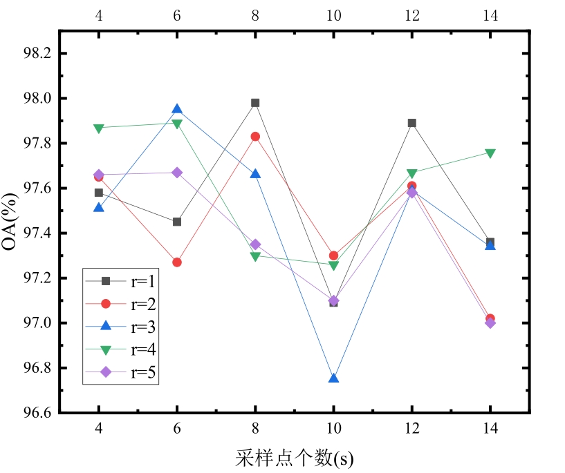 摘要:如何利用较少训练样本达到高分类精度已成为高光谱遥感领域的重要研究方向和极具挑战性任务。针对高光谱图像包含的丰富光谱与空间信息,提出了一种联合局部二值模式LBP(Local Binary Patterns)与K-最近邻KNN(K-Nearest Neighbors)算法的高光谱图像分类方法。首先,通过主成分分析PCA(Principle Component Analysis)对高光谱数据进行降维;然后,使用LBP提取降维后的高光谱图像空间纹理信息,将光谱与空间特征变量堆叠成空—谱特征向量;最后,输入最近邻分类器得到分类结果。选取Pavia University、Indian Pines和Salinas三种公开高光谱数据集的训练集和测试集作为建模和验证数据源,选取KNN、基于径向基核函数的支持向量机(RBF-SVM)、核联合正交匹配追踪(Kernel Simultaneous Orthogonal Matching Pursuit,KSOMP)三种经典分类算法作为比较。在Pavia University与Indian Pines数据集中随机选取10%作为训练样本,总体精度和Kappa系数分别达到99.15%、98.87%和97.88%、97.58%;在Salinas数据集中随机选取2%作为训练样本,总体精度与Kappa系数为98.46%和98.29%。实验结果表明,在训练样本仅为数据集10%甚至2%的条件下,本文提出的方法仍可达到98%以上的分类精度,可满足训练样本难以获取的应用场景对高分类精度要求。