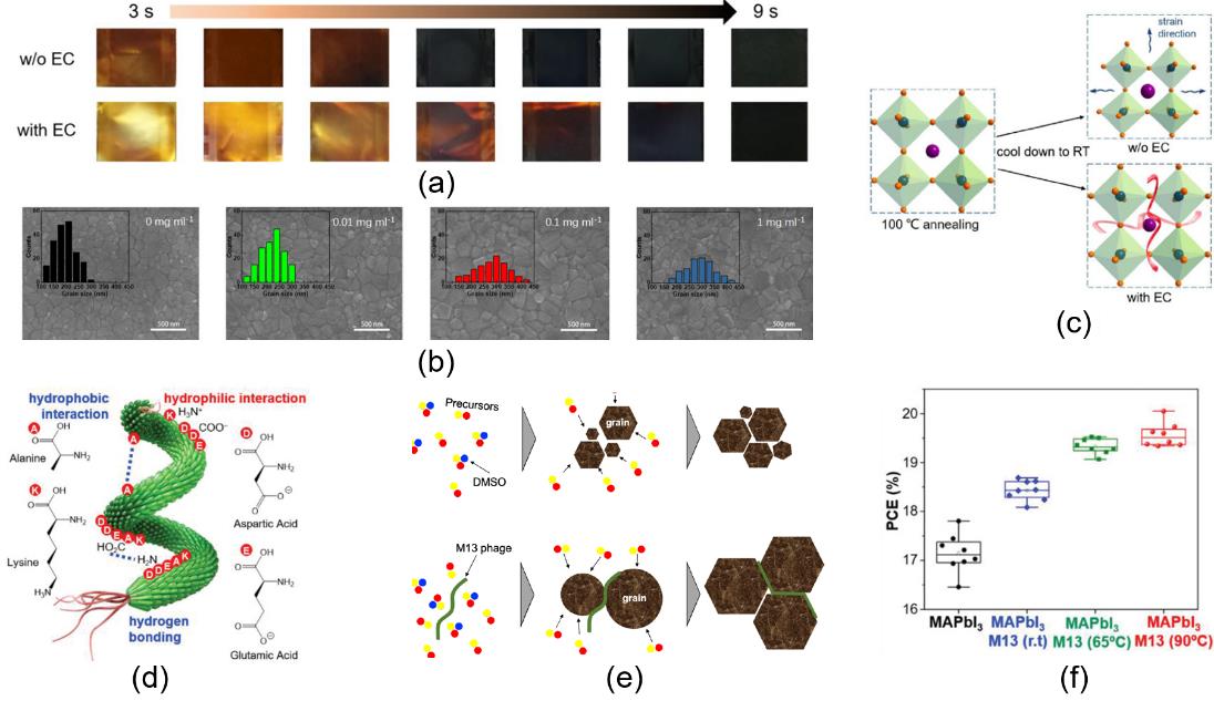 摘要:钙钛矿太阳能电池(PeSCs)因其高效率、低成本和简单的制备工艺而被认为是最有前途的光伏技术之一。PeSCs的能量转换效率和稳定性很大程度上取决于钙钛矿薄膜的质量和器件中的界面,它们是PeSCs非辐射复合损失的主要来源。天然生物材料具有丰富的资源、无毒和生物相容性等优点,在改善PeSCs的钙钛矿层和界面方面显示出巨大的潜力。本文综述了利用天然生物材料实现高性能PeSCs的最新进展。首先讨论天然生物材料在钙钛矿薄膜的形貌优化、缺陷钝化和能级调控方面的作用;同时,讨论利用天然生物材料优化钙钛矿和电荷传输层之间的界面,以及构建可拉伸、可生物相容和可生物降解的电极的策略;最后,展望PeSCs在天然生物材料方面的进一步发展。