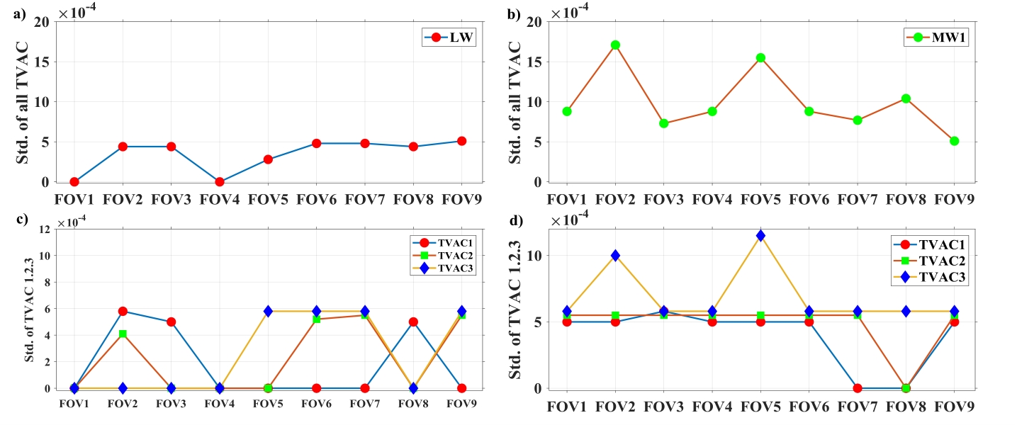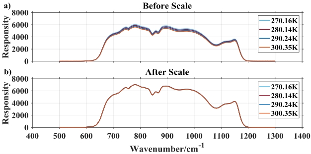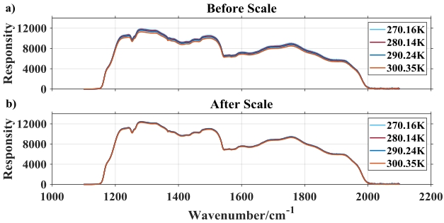 摘要:红外高光谱大气探测仪II型(HIRAS-II)是一台傅里叶变换光谱仪,搭载于世界首颗民用晨昏轨道气象卫星FY-3E上,其研制过程在FY-3D/HIRAS-I产品基础上,重点提升了探测器灵敏度、光谱和辐射定标精度等方面。仪器发射前进行了全面的热真空定标试验,其中非线性订正作为辐射定标过程的重要环节,对辐射定标精度具有重要影响。针对HIRAS-II长波和中波1红外探测器产生的非线性效应,通过缩放带内光谱对原始数据作非线性订正,采用最小化不同温度点复原光谱各波数点的响应度分布和最小化变温黑体定标偏差分布两种方法推导非线性系数。对比辐射定标数据作非线性订正前后的光谱亮温偏差,结果表明,经过非线性订正后的辐射定标精度得到了明显提升。