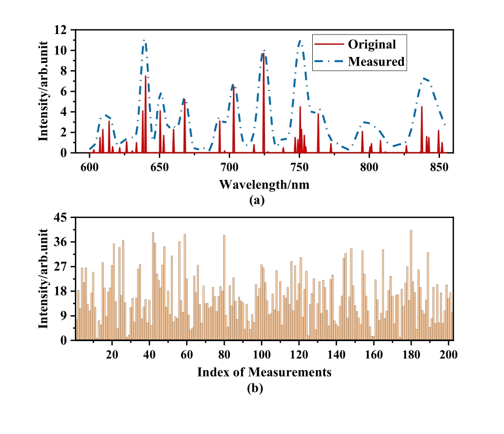 摘要:基于声光可调谐滤波器(AOTF)的光谱仪器已经在生物医学、农业、航空航天等领域中广泛应用。然而,传统的AOTF光谱仪很难在保持光谱分辨率和减少采样次数的同时,还实现系统光通量的增加。针对上述问题,本文提出了一种基于压缩感知理论的AOTF光谱测量方法,利用AOTF可多频驱动的特点,在光谱维度上实现稀疏随机编码复合光信号调制,可利用单元或面阵探测器顺次记录完成压缩采样,再通过压缩感知重建算法获得目标光谱曲线或光谱图像数据立方体。为了验证本方法的有效性,我们利用实际测量得到AOTF光谱响应带宽数据,构建传感矩阵,以展宽光谱为恢复目标,仿真了压缩采样和目标数据重构效果。仿真结果表明,该方法可以通过202次压缩采样,重构得到512个波长点的光谱数据,光谱数据采样率和压缩比为0.39。此采样率下,本方法可以高精度恢复光谱曲线,PSNR指标达到41.75dB,SAM和GSAM指标为0.9998和0.9754。多频同时驱动下,系统光通量平均提升了5倍。与传统逐波长点扫描的采样方式相比,该方法能够在保持原有光谱分辨率的前提下减少总采样次数,提高系统的光通量,同时还压缩了光谱数据,在微弱信号检测、物质快速识别以及光谱数据传输和存储等领域具有十分重要的意义。