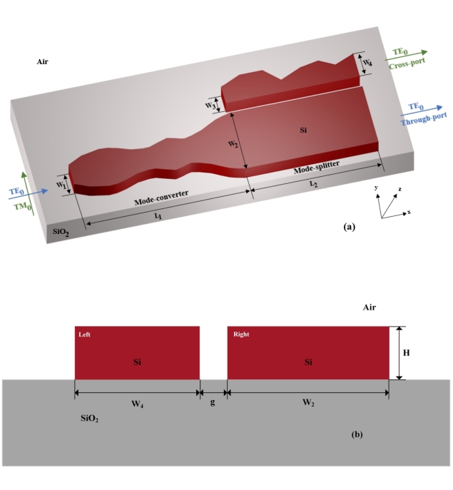 摘要:提出了一种基于模式演变原理的紧凑型偏振分束旋转器(Polarization Splitter Rotator,PSR)。该器件由锥型TM0-TE1模式转换器与非对称定向耦合(Asymmetric Directional Coupler,ADC)结构的模式分束器组成,经粒子群算法(Particle Swarm Optimization,PSO)和样条插值原理优化后的器件总长度仅为45 μm。利用时域有限差分法(Finite Difference Time Domain method,FDTD)对器件进行仿真,数值结果表明:输入TE0模式时,在100 nm(1500~1600 nm)带宽内具有低插入损耗(<0.007 dB)、低串扰(<-28.7 dB)、高偏振消光比(>49.1 dB);输入TM0模式时,在整个C波段内具有低插入损耗(<0.34 dB),低串扰(<-47.1 dB),高偏振消光比(>15.5 dB),且在中心波长1550 nm处插入损耗值仅为0.06 dB。此外,对器件的公差进行了分析,结果表明该器件具有良好的鲁棒性。所设计的PSR具备低损耗、小尺寸以及低串扰特性,在未来大规模光子集成领域具有重要应用价值。