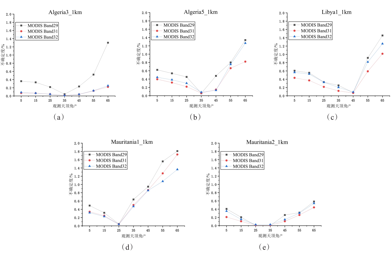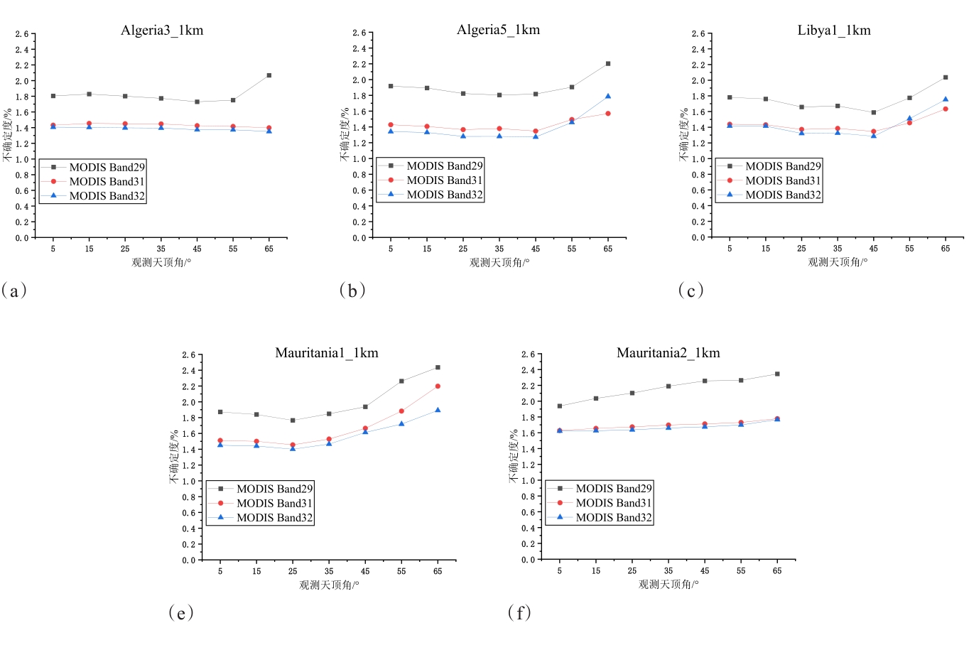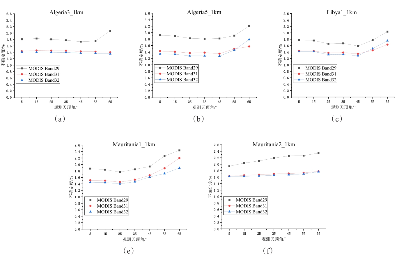 摘要:地表比辐射率方向性研究是国际热红外定量遥感研究领域的热点与难点,现有的热红外沙地比辐射率方向性模型存在先验参数较多、精度较低、适用性差等问题。论文基于5个伪不变定标场,即Algeria3_1km、Algeria5_1km、Libya1_1km、Mauritania1_1km及Mauritania2_1km,综合利用长时序极轨卫星载荷AQUA/MODIS与静止轨道卫星载荷MSG/SEVIRI多角度观测数据,经过载荷相互校准、大气纠正、影像数据时空匹配等处理,基于热红外辐射传输方程,获取0~65°观测天顶角范围内各研究区方向性比辐射率,建立公里级像元尺度比辐射率方向性模型,并对其进行了不确定度评估。结果表明:地表比辐射率随观测天顶角增大而降低,其方向性效应随波段中心波长的增加而减小,Algeria5_1km区域的方向性效应最小,Mauritania1_1km区域的方向性效应最强;各研究区比辐射率方向性模型不确定度均随观测天顶角的增大而增大,模型不确定度均优于3%。
