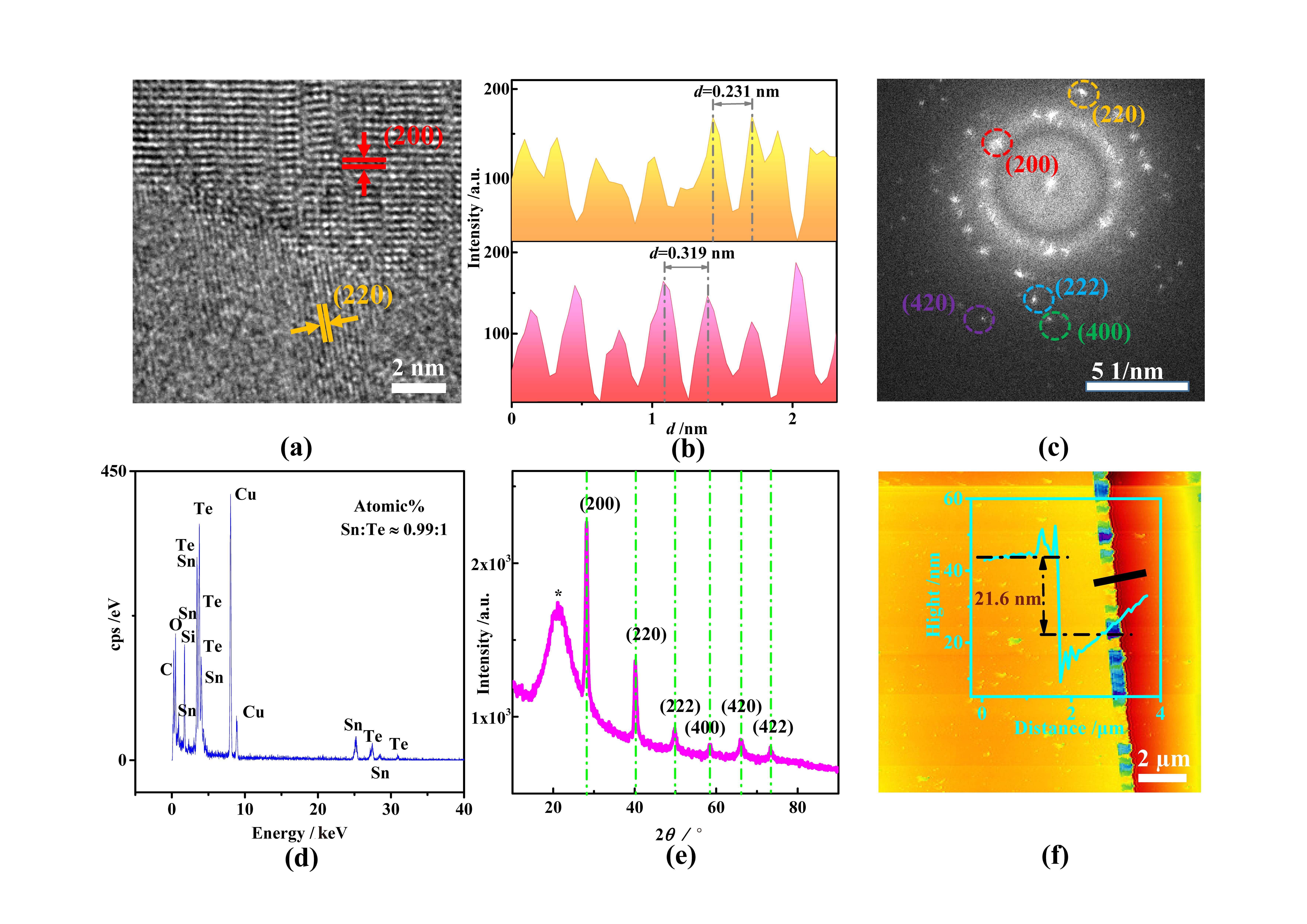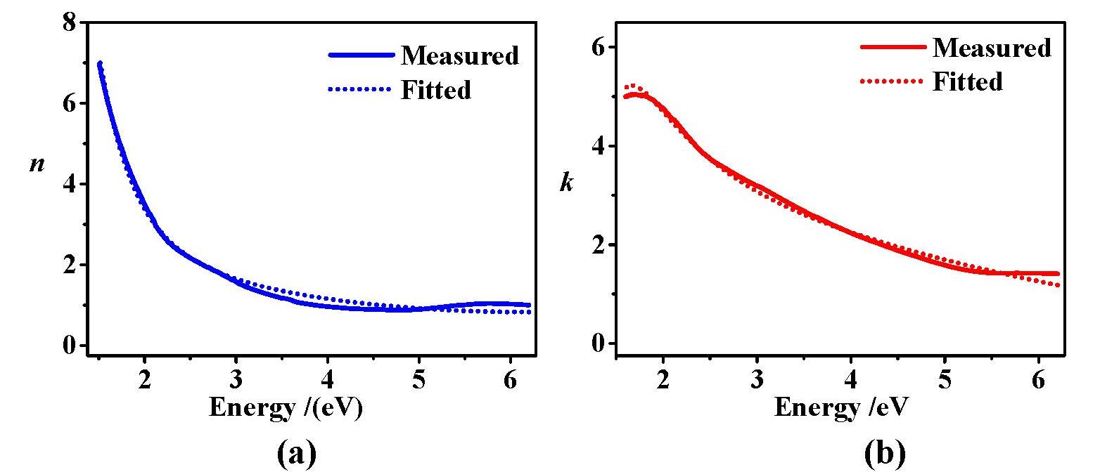 摘要:SnTe纳米薄膜材料光学常数的准确获取,对于其在高性能光电器件设计和在光电子领域的潜在应用具有重要的意义。然而,目前仍然很少有关于获取其纳米薄膜光学常数方法的相关研究报道。采用磁控溅射法以SnTe单靶为靶材,在石英衬底上制备了SnTe纳米薄膜;在未加衬底温度和未进行退火处理的条件下,通过制备工艺参数优化,即得到晶化的、组分可控的面心立方结构SnTe纳米薄膜。采用椭圆偏振光谱法,建立不同的拟合模型结构,利用SE数据库中的SnTe材料数据列表和Tauc-Laurents模型对所制备的SnTe纳米薄膜材料的膜厚、组成及折射率、消光系数等光学常数进行了研究。结果显示,具有该厚度的SnTe纳米薄膜材料在可见光波段具有较高的折射率、在可见到近红外具有较宽的光谱吸收。