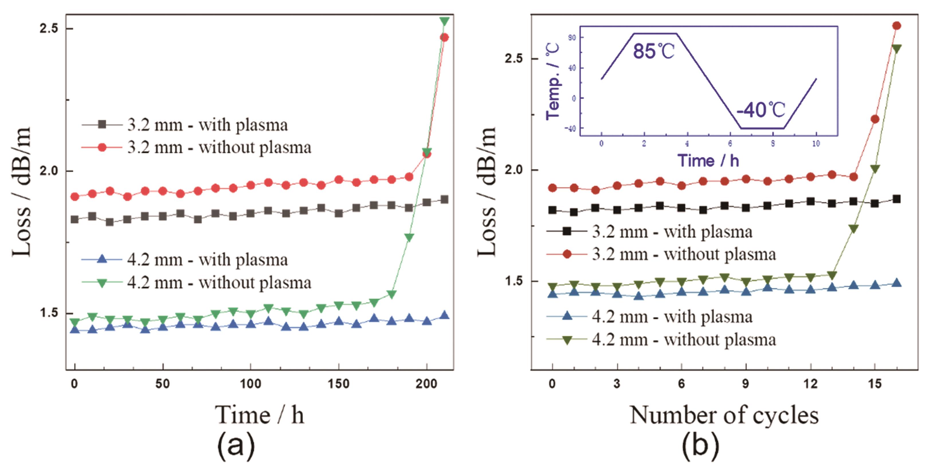 摘要:等离子体处理ABS管提升了ABS/Ag镀层太赫兹空芯波导的性能。胶带法测试结果表明,等离子体处理后,银镀层的附着力由5级提升至2级。等离子体处理后的ABS管内表面银层的均匀性和致密度更高,高质量的银层有利于降低波导的损耗。未经等离子体处理的4.2 mm内径的ABS/Ag镀层空芯波导在0.3 THz和0.1 THz时的直线损耗分别为0.72 dB/m和1.47 dB/m,等离子体处理后其损耗分别降至0.70 dB/m和1.44 dB/m,且波导能够在冷热环境中稳定传输太赫兹波。等离子体处理后的样品在超过200小时的湿热老化和16次的高低温循环老化试验后直线损耗升高小于0.1 dB/m,而未经等离子体处理的样品的损耗升高大于1 dB/m。研究结果表明,等离子体处理后的ABS/Ag镀层太赫兹空芯波导损耗更低、传输可靠性更高、耐老化性更好,可用于构建下一代通信、传感及太赫兹成像系统等。