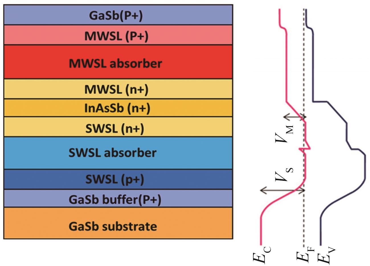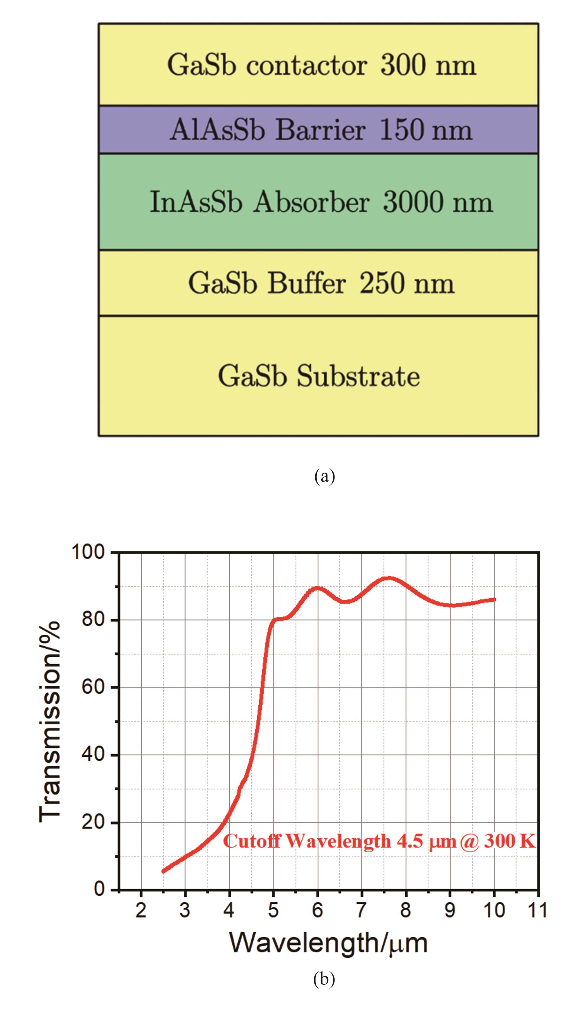 摘要:InAs/InAsSb II类超晶格避免了InAs/GaSb II类超晶格中与Ga原子相关的缺陷复合中心,具有更高的少数载流子寿命,在高工作温度中波红外探测器制备方面有着良好的应用前景。少数载流子单极势垒结构通常被用来抑制探测器暗电流,如nBn结构探测器。在InAs/InAsSb II类超晶格nBn中波红外光电探测器中,势垒层常采用AlAsSb等多元合金材料,阻挡多数载流子的输运。然而,势垒层与吸收层存在的价带偏移(VBO)使得光电流往往需要在大偏压下饱和,从而增大了探测器暗电流。本文设计了一种AlAsSb/InAsSb超晶格势垒,旨在消除VBO并降低量子效率对偏压的依赖性。研究结果显示,150 K下,设计制备的nBn光电探测器的50%截止波长为4.5 μm,探测器光响应在-50 mV的小反向偏压下达到了饱和,3.82 μm处的峰值响应度为1.82 A/W,对应量子效率为58.8%。在150 K和-50 mV偏压下,探测器的暗电流密度为2.01×10-5 A/cm2,计算得到在3.82 μm的峰值探测率为6.47×1011 cm·Hz1/2/W。