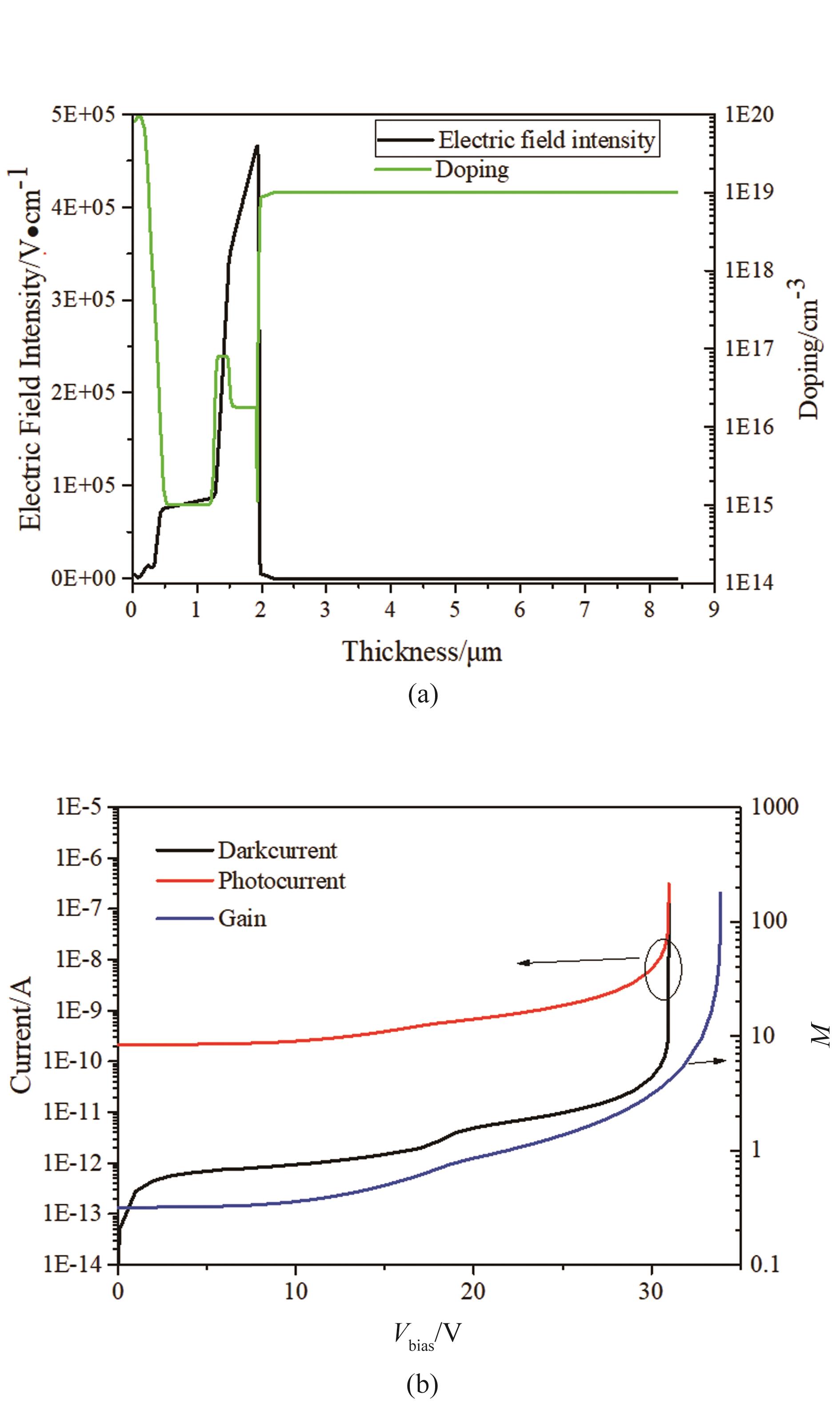 摘要:本文基于目前对宽波段探测器的应用需求,设计了一种在250~1 100 nm范围有较高响应的硅雪崩光电探测器(Si APD),不需要拼接即可实现紫外-可见-近红外波段光的高效探测。分别对硅的紫外增强和(近)红外增强进行了分析,在此基础上,为获得宽波段响应Si APD,对器件结构进行模拟设计,采用光背入射等方式,提高短波吸收,同时保证近红外吸收。模拟优化的Si APD器件峰值波长940 nm左右,在250 nm和1 100 nm处响应光电流均超过峰值的15%,这种结构的器件适用于多光谱及未来高精度探测等应用领域。