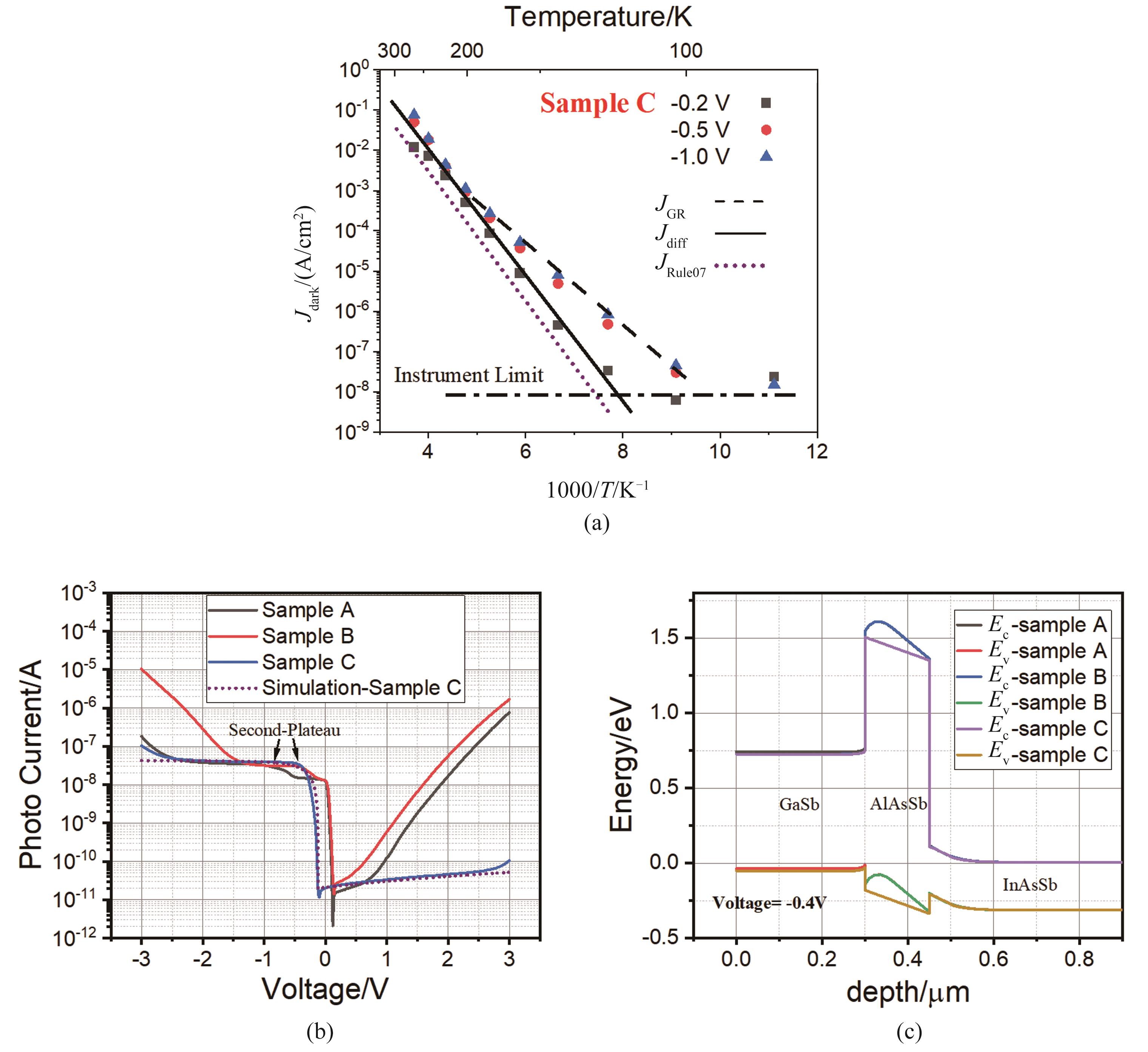 摘要:在GaSb衬底上外延生长晶格匹配的XBn结构InAsSb具有高晶体质量,在高工作温度(HOT)下能够实现极低的暗电流。该结构具有优越的性能,在阻挡多数载流子的同时,不影响空穴传输。为了进一步探索XBn单极势垒结构的能带和载流子输运机理,系统地研究了掺杂对PBn结构InAsSb光电探测器的暗电流、光电流和隧穿特性的影响。制备了三个高质量InAsSb样品,吸收层(AL)均为非故意掺杂(UID),对接触层(CL)和势垒层(BL)进行不同浓度的p型掺杂。随着CL中p型掺杂浓度的增加,器件的开启偏压变大,而BL中的p型掺杂会导致隧穿效应发生在更低的偏置电压下。对于BL非故意掺杂的样品,表现出极低的暗电流,仅为5×10-6 A/cm2。该样品的器件光电流特性可以通过背靠背二极管模型拟合,揭示了BL两侧存在两个反向的空间电荷区。