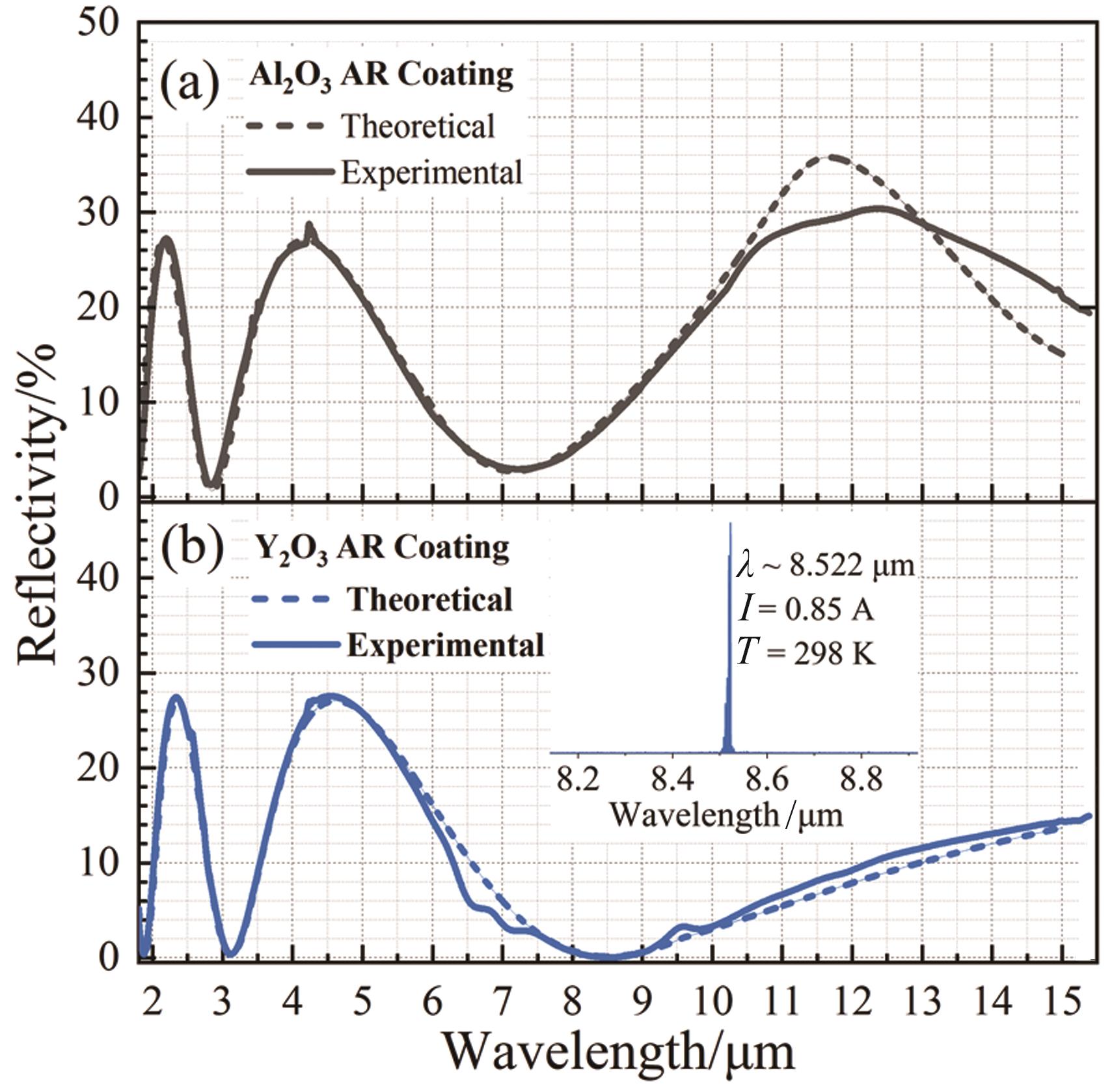摘要:通过研究和优化长波红外量子级联激光器(LWIR QCLs)的光学腔面增透(AR)膜,可提高器件的输出性能。与Al2O3膜系相比,Y2O3 AR膜表现出更高的腔面光学灾变(COMD)水平,两种膜系的光学腔面镀膜均无光束转向效应。对激射波长为8.5 μm的3 mm腔长、9.5 μm脊宽掩埋异质结(BH)LWIR QCL使用Y2O3膜系的金属高反(HR)膜和反射率约0.2%的AR膜,在298 K下获得了2.19 W的最高脉冲峰值功率,较未镀膜器件提高149%。对于连续波(CW)操作,通过优化Y2O3 AR膜的反射率,最高输出功率达到0.73 W,较未镀膜器件提高91%。