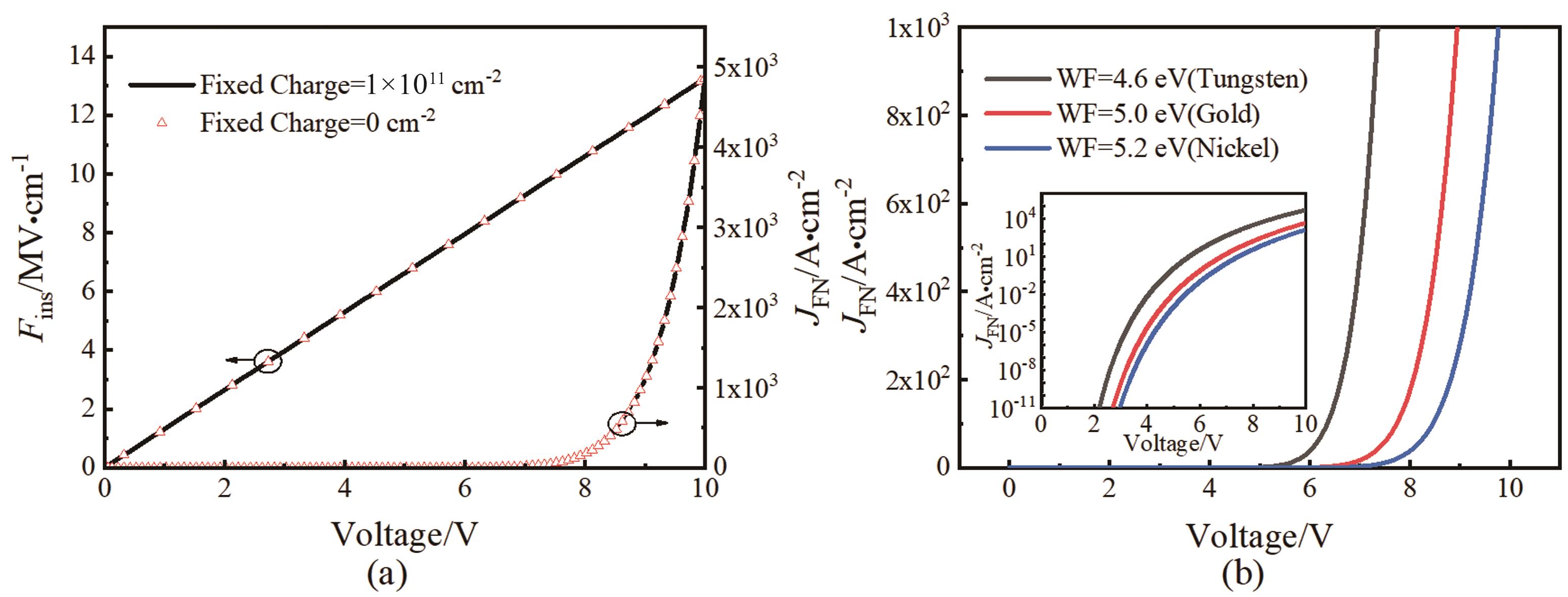 摘要:六方氮化硼(h-BN)由于其优良特性被广泛应用于栅介质层、钝化层、隧穿层等功能。目前,对关于超薄h-BN的基本物理性质和其中的电子隧穿效应的研究还存在不足。文中采用实验与理论相结合的研究方法,通过拟合金属/绝缘体/金属结构的电流-电压曲线成功提取了不同层数h-BN的有效质量。结果显示在4~22层范围内,h-BN的有效质量随着层数的增加而单调下降。作者利用已提取的有效质量精确确定了当h-BN中发生电子隧穿时,Fowler-Nordheim隧穿模型的物理参数。此外,文中使用该物理参数在Sentaurus TCAD软件中研究了金属/h-BN界面处固定电荷以及不同种类的金属电极对该结构中Fowler–Nordheim隧穿的影响。这项工作对促进h-BN相关红外物理和技术领域的应用具有一定的参考和指导意义。