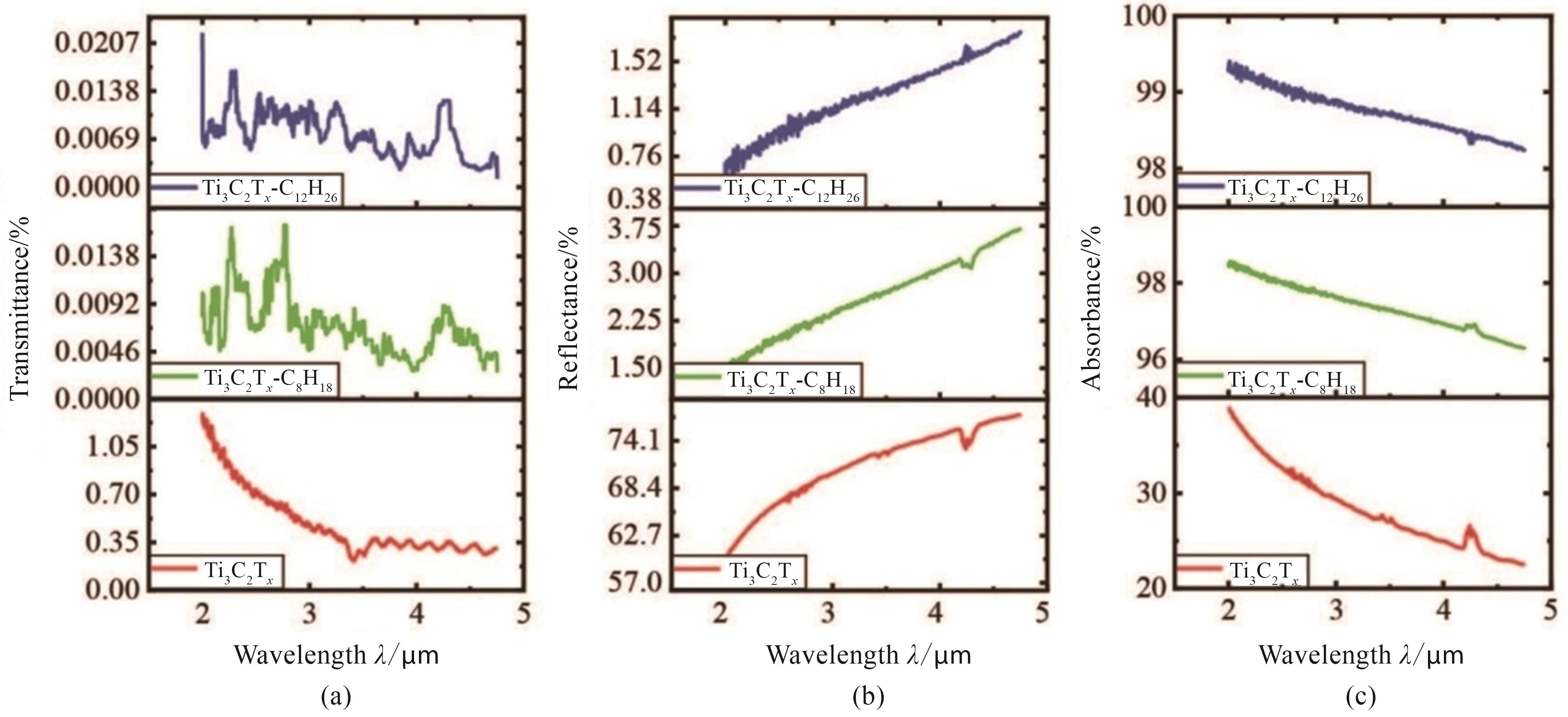 摘要:本文介绍了一种具有低成本高效益的化学方法,通过将辛烷(C8H18)和十二烷(C12H26)两种类型的烷烃基团分别嫁接到MXene表面,实现对薄片的弯曲形变,从而增强了中波长的红外吸光度。烷烃的链长超过表面官能团Tx(=O、-OH、-F)的键长,从而将片内应力和片间应力作用到Ti3C2Tx MXene薄片表面。电子显微镜和原子力显微镜测试表明,薄片有明显的边缘褶皱和拉伸/压缩变形。薄片终端的烷烃将Ti3C2Tx Mxene从2.5 μm到4.5 μm波长的中波红外区域的吸光度由略高于50%,提高到99%以上。这种吸收增强归因于Ti3C2Tx MXene红外反射率的降低。C-H键骨架振动覆盖了上述区域,并部分降低了表面反射率。同时,由于边缘褶皱和拉伸/压缩导致的薄片变形增加了比表面积,从而增加了吸收。此结果对中波红外伪装技术具有一定的应用价值。