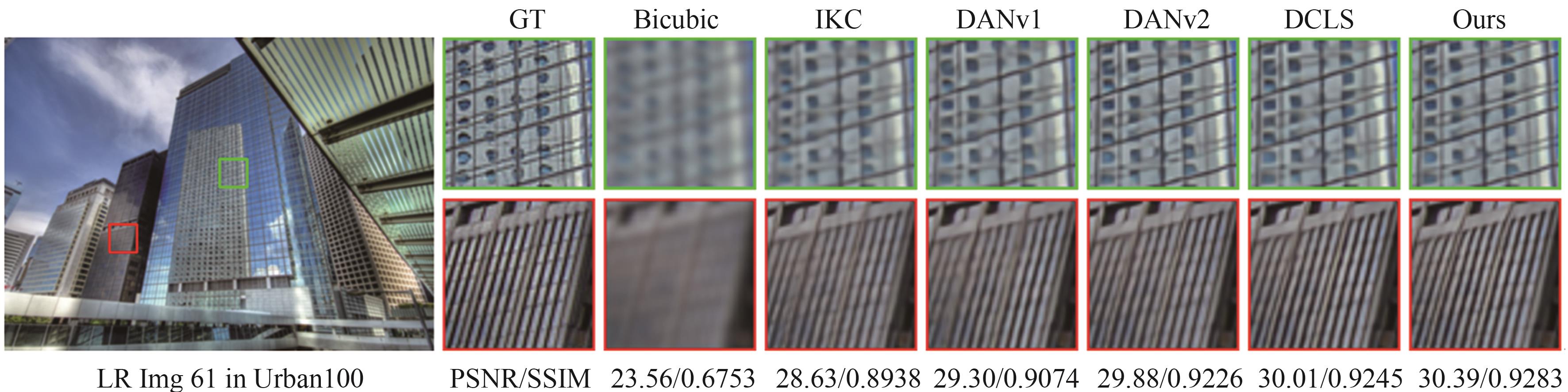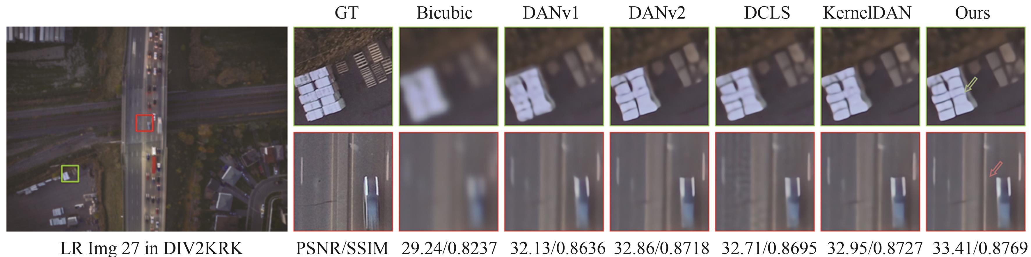 Abstract:The existing deep learning-based image blind super-resolution algorithms only utilize neural networks to learn the end-to-end mapping from low-resolution (LR) images to high-resolution (HR) images, only allowing the network to implicitly learn image priors, resulting in algorithms that still produce blurry super-resolution results. To address the above issues, a deep learning image blind super-resolution algorithm guided by sparsity and self-similarity priors is proposed. Initially, for various LR image inputs, a dynamic linear kernel estimation module is employed to effectively estimate the corresponding blur kernels; Subsequently, a deep unfolding deconvolution filtering module based on the Fast Iterative Shrinkage-Thresholding Algorithm (FISTA) is utilized to explicitly model the sparsity prior of signal, achieving deconvolution restoration of the degraded images; Finally, a dual-path multi-scale large receptive field restoration module leverages the self-similarity prior of images for super-resolution recovery. The experimental results indicate that, compared to existing methods, the proposed algorithm achieves a peak signal-to-noise ratio (PSNR) of 31.66 and a structural similarity index (SSIM) of 0.8725 on the publicly available Gaussian8 dataset, and attains a PSNR of 29.08 and an SSIM of 0.8007 on the DIV2KRK dataset. The images restored by the proposed algorithm not only exhibit the highest restoration metrics but also superior visual quality.