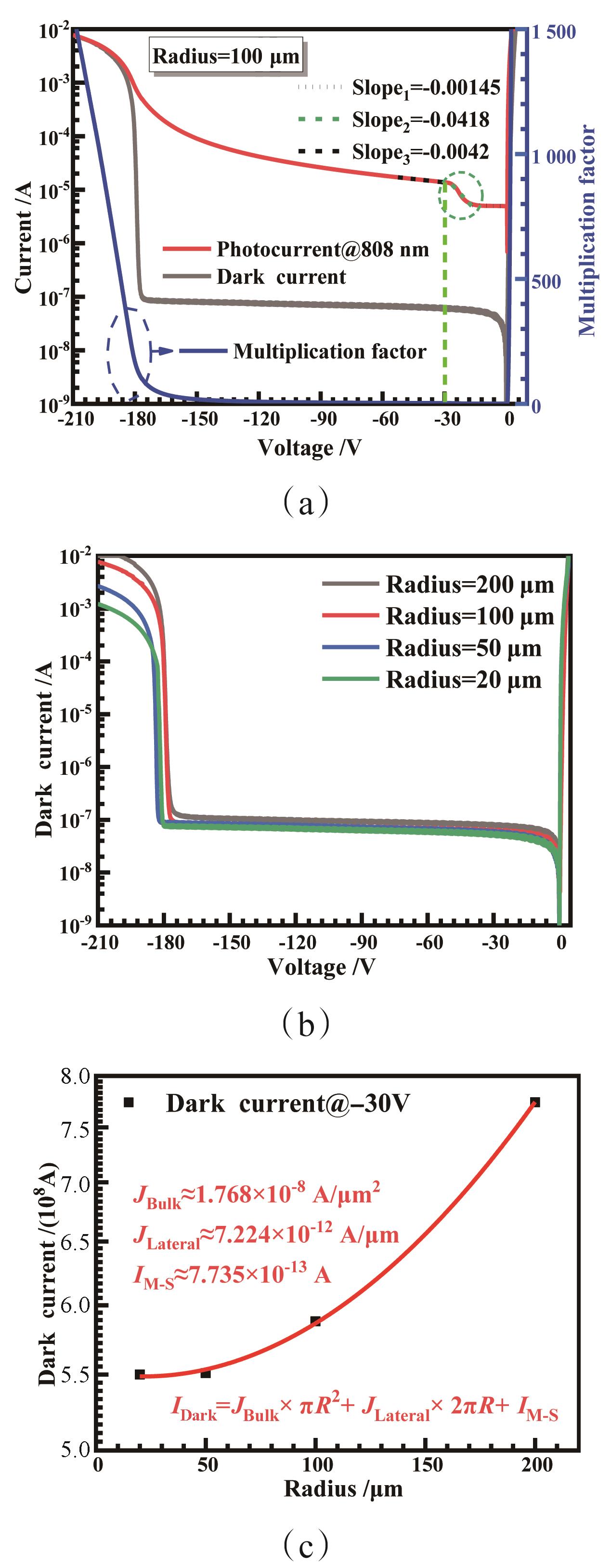 Abstract:This paper investigates the punch-through characteristics of separate absorption, charge and multiplication avalanche photodetector (SACM APD). By analyzing the device''s spectral response, capacitance characteristics, and current-voltage (I-V) characteristics at various operating temperatures, and combining these with simulated internal electric field and energy band distributions from the SILVACO platform, we analyzed examined the performance of the SACM APD before and after punch-through and established a corresponding mathematical model. Through structural and process parameter optimization for silicon-based SACM APD devices, simulations revealed that when the ion implantation energy of the field-control layer was 580 keV, the optimized device exhibited a punch-through threshold voltage of -30 V and a capacitance reduction to one-third of the pre-punch-through value. Subsequently, a silicon SACM APD device was fabricated using the complementary metal-oxide-semiconductor (CMOS) process. Measurements confirmed a punch-through threshold voltage of -30 V, a 2.18-fold increase in photocurrent at 808 nm (punch-through), a redshift of the peak responsivity wavelength from 590 nm (pre-punch-through) to 820 nm (post-punch-through), and an elevation of the peak responsivity from 0.171 A/W@590 nm to 0.377 A/W@820 nm. The capacitance was also reduced to one-third of the pre-punch-through value at 1 MHz.