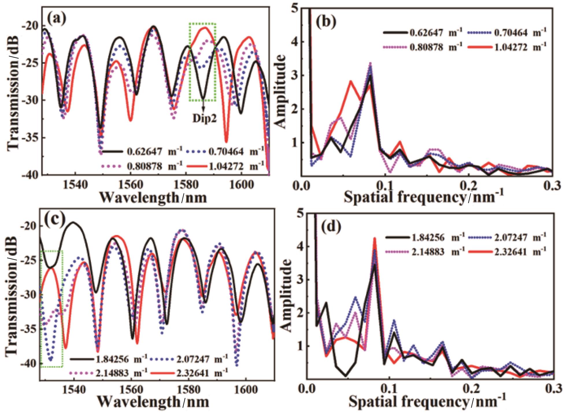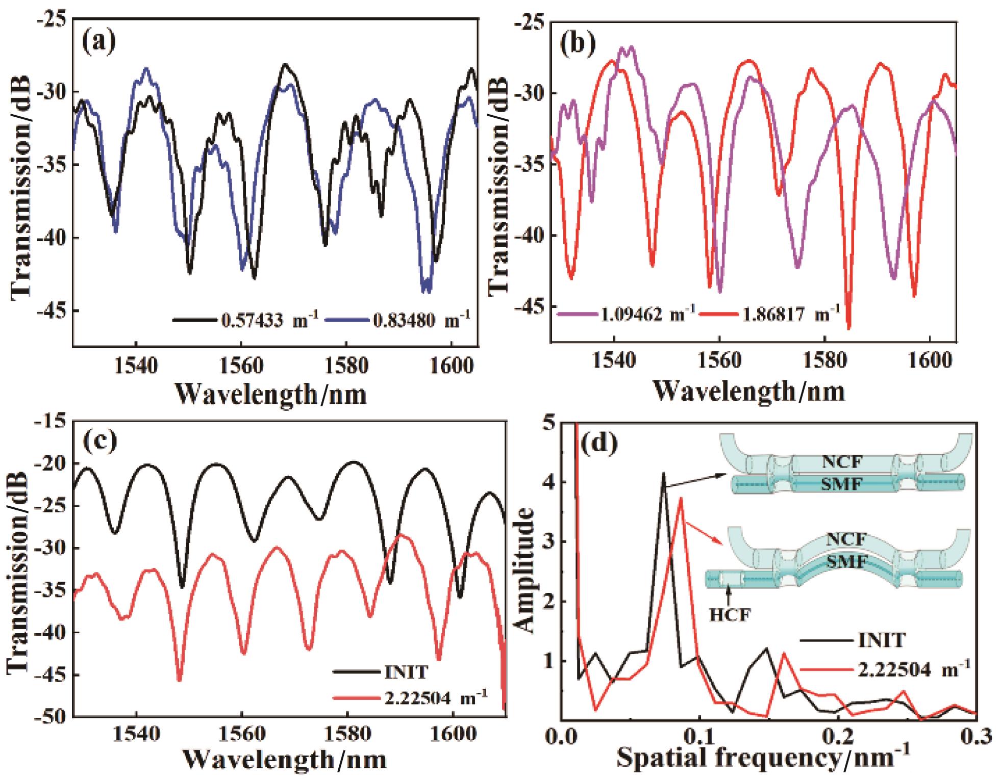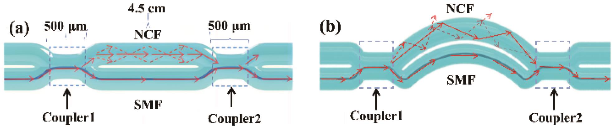 Abstract:A novel near-infrared all-fiber mode monitor based on a mini-two-path Mach-Zehnder interferometer (MTP-MZI) is proposed. The MTP-MZI mode monitor is created by fusing a section of (no-core fiber ,NCF) and a (single-mode fiber ,SMF) together with an optical fiber fusion splicer, establishing two distinct centimeter-level optical transmission paths. Since the high-order modes in NCF transmit near-infrared light more sensitively to curvature-induced energy leakage than the fundamental mode in SMF, the near-infrared high-order mode light leaks out of NCF when the curvature changes, causing the MTP-MZI transmission spectrum to change. By analyzing the relationship between the curvature, transmission spectrum, and spatial frequency spectrum, the modes involved in the interference can be studied, thereby revealing the mode transmission characteristics of near-infrared light in optical fibers. In the verification experiments, higher-order modes were excited by inserting a novel hollow-core fiber (HCF) into the MTP-MZI. When the curvature of the MTP-MZI changes, the near-infrared light high-order mode introduced into the device leaks out, causing the transmission spectrum to return to its original state before bending and before the HCF was spliced. The experimental results demonstrate that the MTP-MZI mode monitor can monitor the fiber modes introduced from the external environment, providing both theoretical and experimental foundations for near-infrared all-fiber mode monitoring in optical information systems.