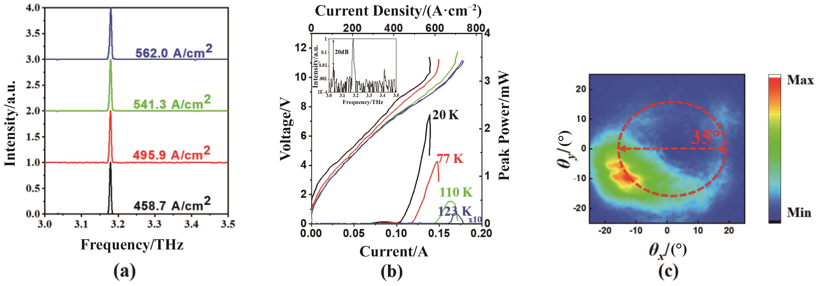 Abstract:A single-mode terahertz quantum cascade laser (THz-QCL) with a two-dimensional patch antenna array as a resonant cavity is proposed and realized. The active region of each patch antenna is sandwiched between two metal layers, exhibiting full-scale subwavelength characteristics and exciting a vertical electric quadrupole mode with low radiation loss. The inter-antenna coupling within the array effectively suppresses electromagnetic leakage in the plane, allowing for a high-quality factor and low threshold current density even with only a few antennas in the array. As a result, the laser''s power consumption is reduced to 950 mW. Moreover, the discrete antenna array design provides a larger heat dissipation area compared to the heat-generating area, and with the lateral heat dissipation channels offered by the unpumped regions, the thermal resistance per unit area is as low as 5.6 mK/W/cm2. By significantly reducing power consumption and enhancing heat dissipation efficiency, the laser achieves a lasing frequency of 3.18 THz, a side-mode suppression ratio (SMSR) of 19.5 dB, and a beam divergence angle of 35°×35°. It operates continuously at 3.14 mW at 20 K, with a maximum continuous operation temperature of 90 K, notably higher than that of Fabry-Pérot cavity lasers made from the same material. This work provides a novel approach to improve the continuous operating temperature of THz-QCLs.